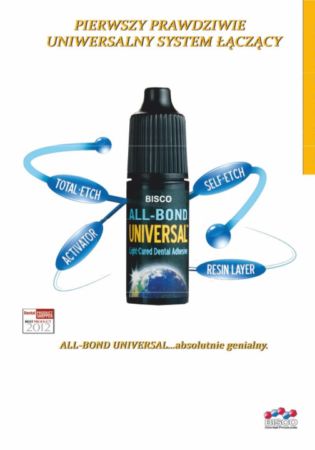 ALL BOND UNIVERSAL – Światłoutwardzalny, jednoskładnikowy system łączący VI generacji, zapewniający wiązanie metodą samowytrawiania jak również z użyciem wytrawiacza metodą „Total-etch”. Idealny pod wszystkie utwardzane światłem, dualne, chemoutwardzalne kompozyty, cementy, porcelanę, metal, cyrkon, aluminium itp., wskazany w każdej sytuacji klinicznej.