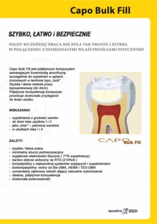 Capo Bulk Fill jest półpłynnym kompozytem zawierającym krzemionkę amorficzną szczególnie do wypełnień w zębach trzonowych w technice typu “bulk”. Szybka i łatwa metoda pracy bezwarstwowej (do 4mm) Półpłynna konsystencja kompozytu powoduje doskonałe przyleganie do ścian ubytku.